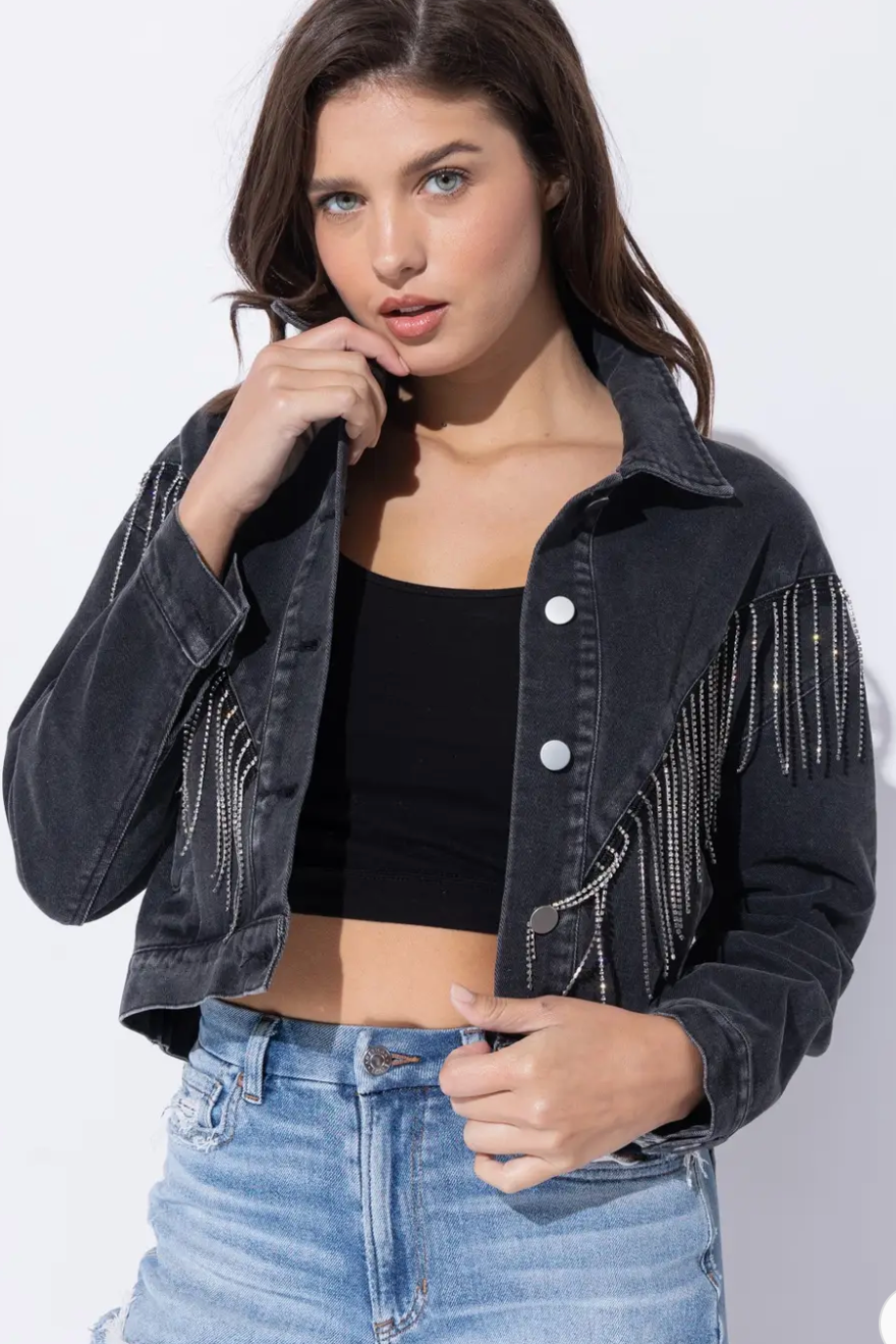 The show topper jacket! Black cropped denim jacket lined with bling fringe.