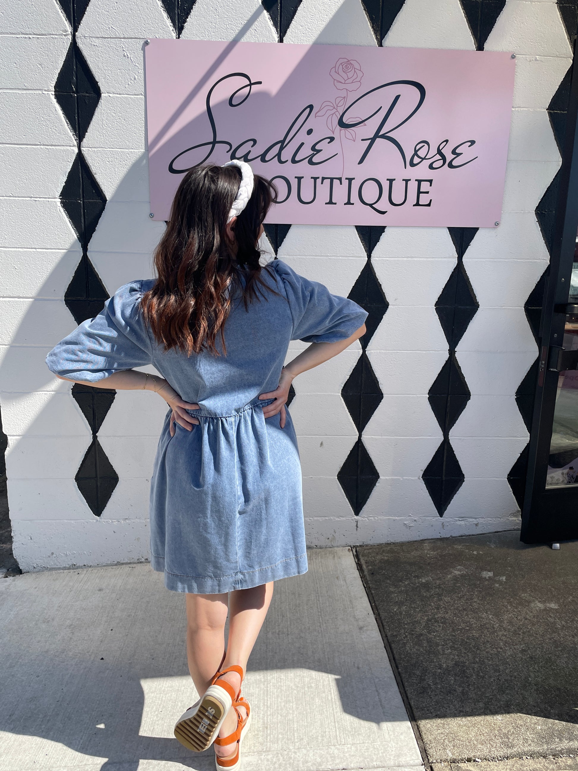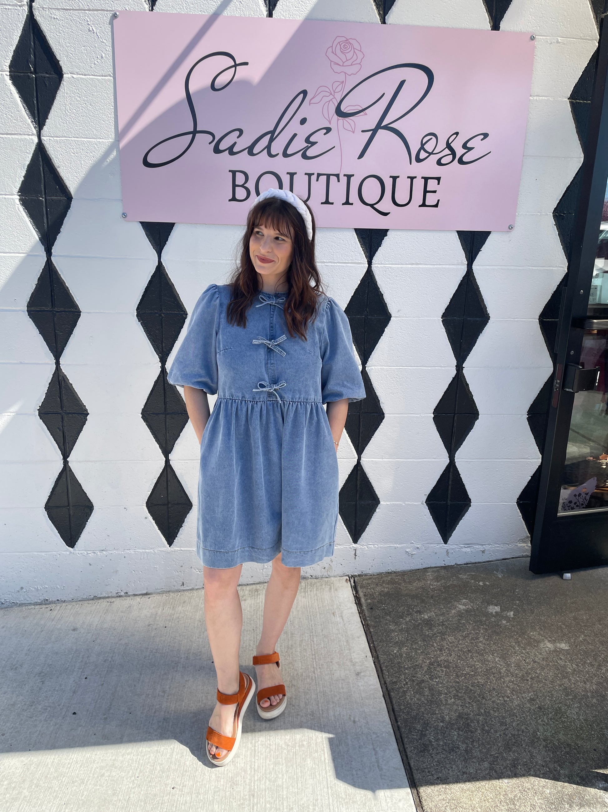 This denim dress has pockets! And the perfect balloon sleeves with three bow ties in the front.